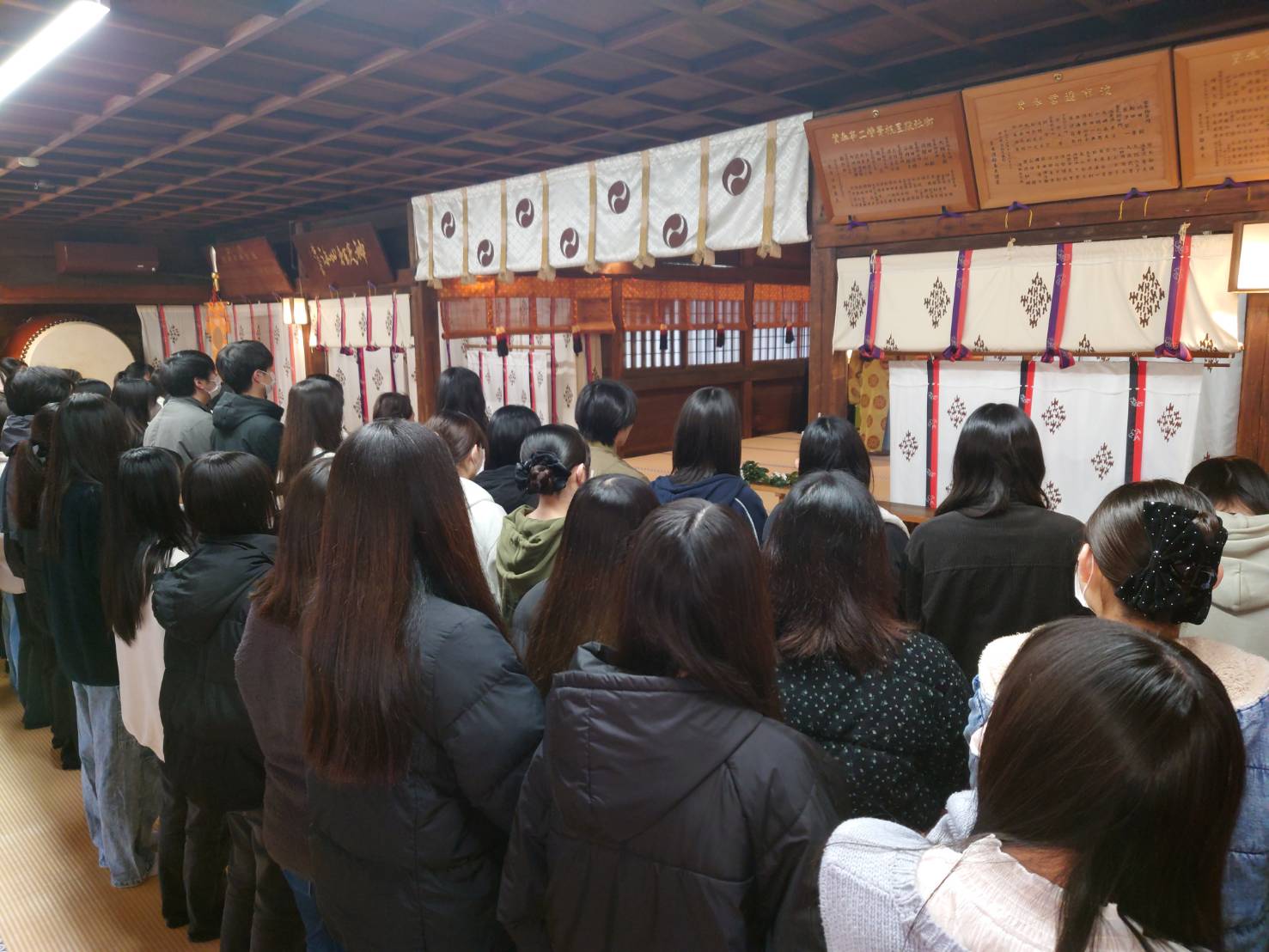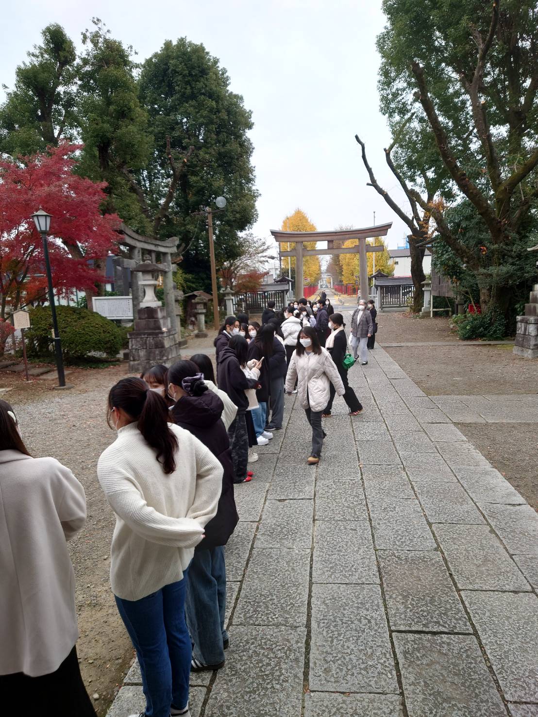 境内や参道には、紅葉した美しいもみじや銀杏が立ち並びます。キンと冷える寒さがみんなを緊張させ、鳥居や本殿をより一層引き立てます。何度も何度もお祈りしました。