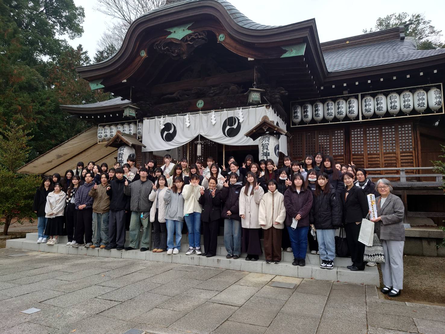 早朝、須賀神社に全員が集まりました。1080年以上の歴史を誇る由緒ある須賀神社。藤原秀郷が戦勝を祈願し、その祈りが成就して以来、地域の守護神として、また祈願と癒しの場として、多くの人々に親しまれています。