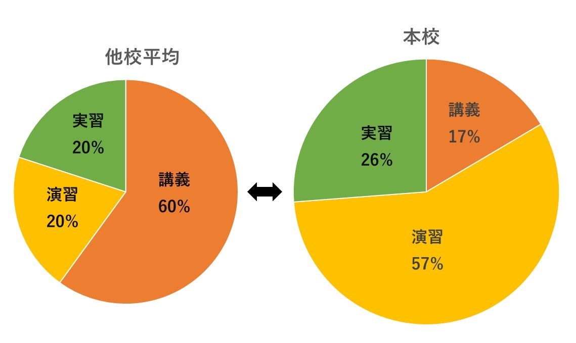 本校の授業は演習形式(グループ学習)中心で、全体の約6割を占めます。先生が一方的に講義をするのではなく、学生が主体となって特定のテーマについて研究したり、問題を解いたり、議論をしたり、発表したりする形式の授業で、少人数で行われることが多く、学生同士や教員と活発なやり取りをしながら、理解を深めることを目的としています。